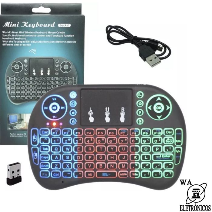 Design ergonômico e compacto, sendo perfeito para uso sem cansar as mãos, além da praticidade de leva-lo para qualquer lugar. Sua fonte de energia é através de uma bateria de lítio, a qual é recarregada com cabo USB. Teclado iluminado, sendo possível trocar a cor dos leds, basta realizar o seguinte comando: Pressione o botão FN e aperte o botão F2.